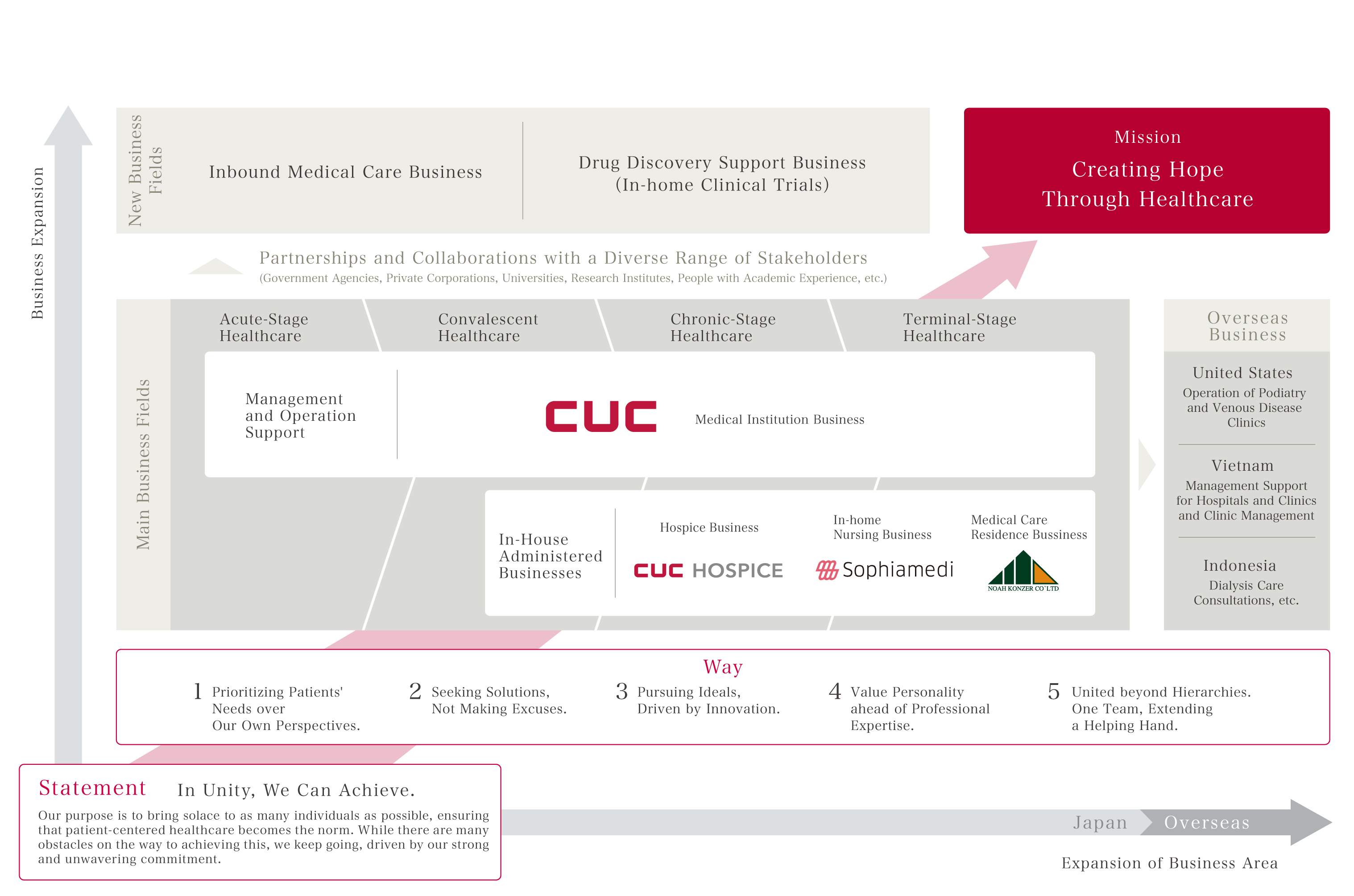 CUC was established in August 2014 and has developed various support businesses in the healthcare field. In 2017, we launched our own operations, including hospices and nursing stations, to achieve new business development rooted in the essential issues of the medical field. Together with our member who share the same mission of “Creating Hope through Healthcare,”we will continue to confront the challenge of the healthcare market in the Japanese and foreign market.