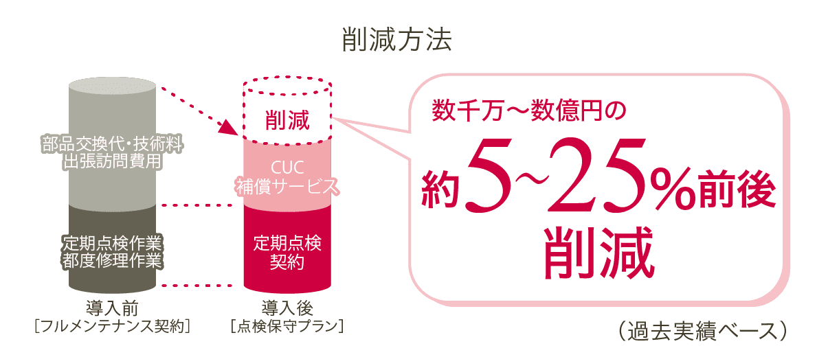 現在の保守契約内容を分析し、フルメンテナンスから定期点検保守プランに切替えることでどのくらいの削減が出るかをまずは診断させていただきます。診断の結果を踏まえてご検討いただき、弊社補償サービスに加入いただくことでコスト削減が実現可能です。