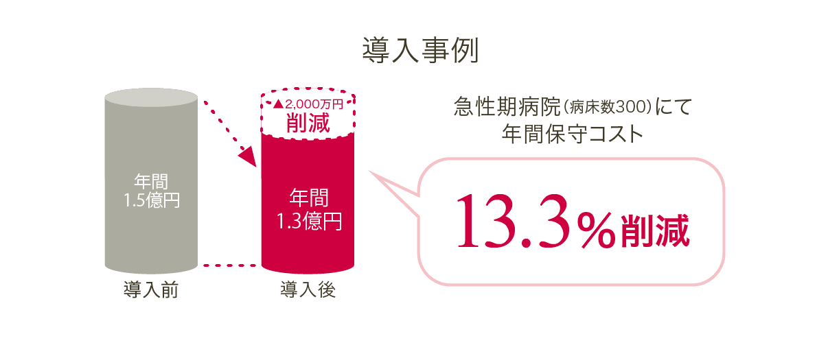 本ページに記載の事例は過去の導入事例に基づく削減実績です。実際の削減効果は貴院のご契約内容や規模によって異なります。