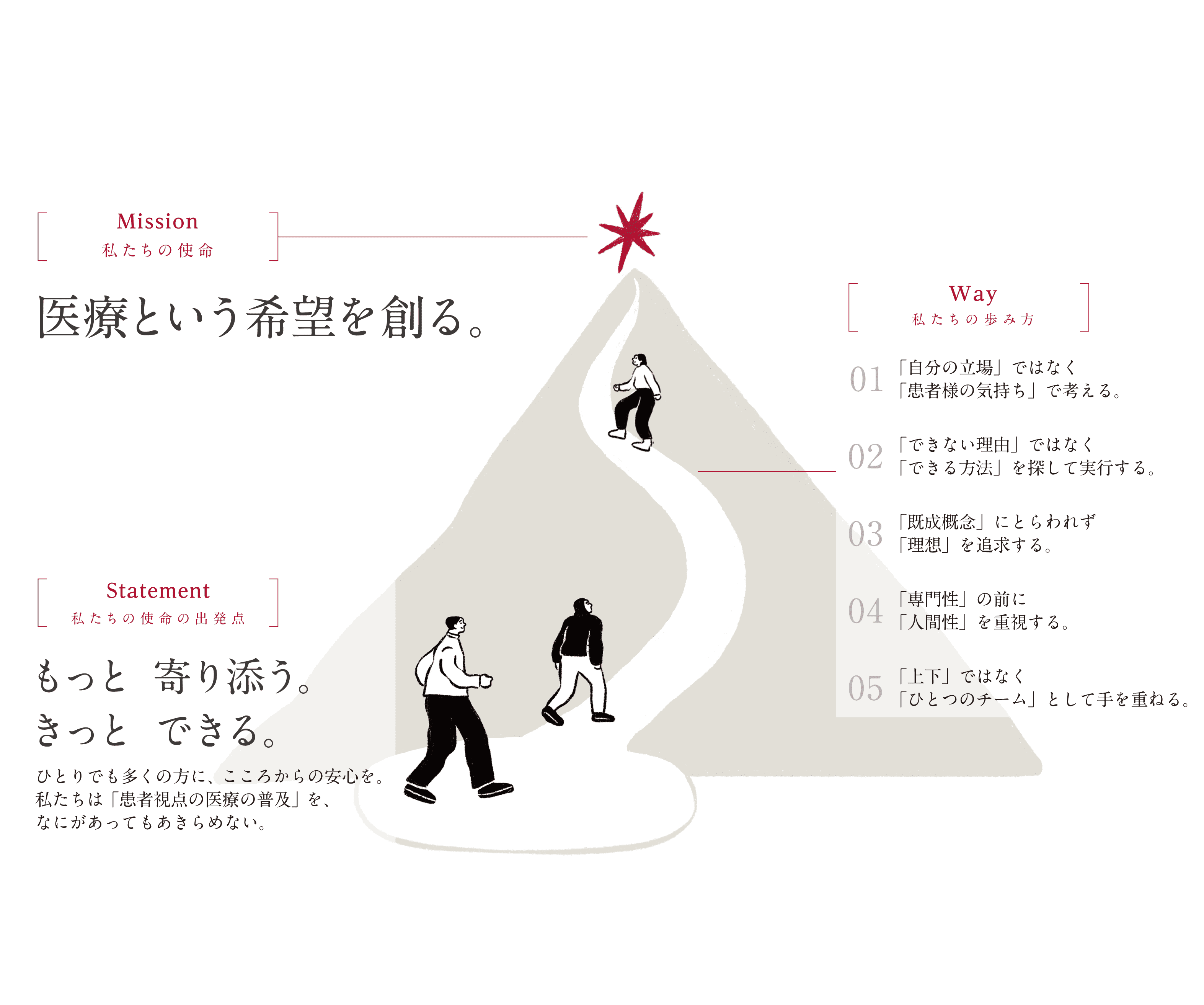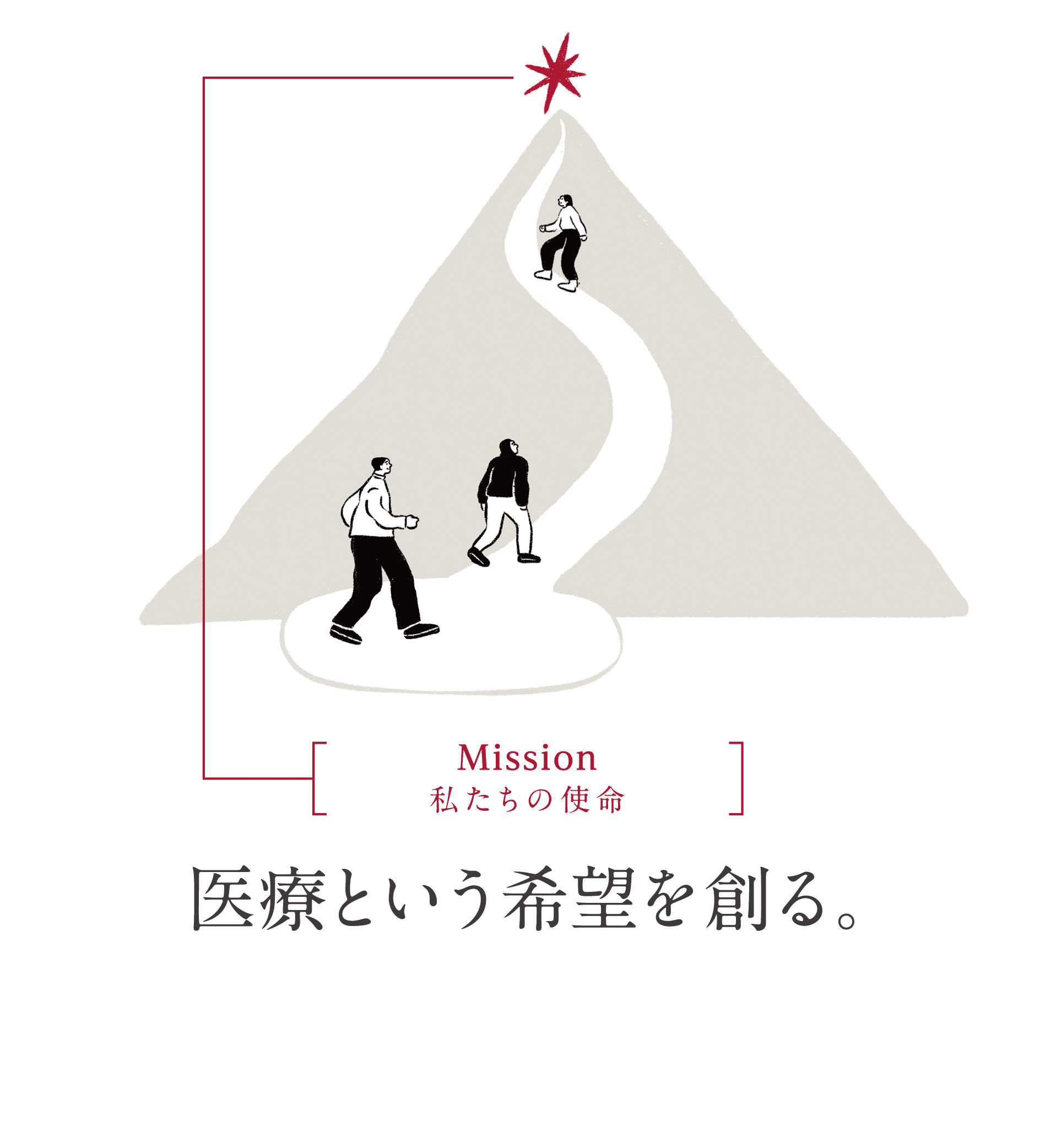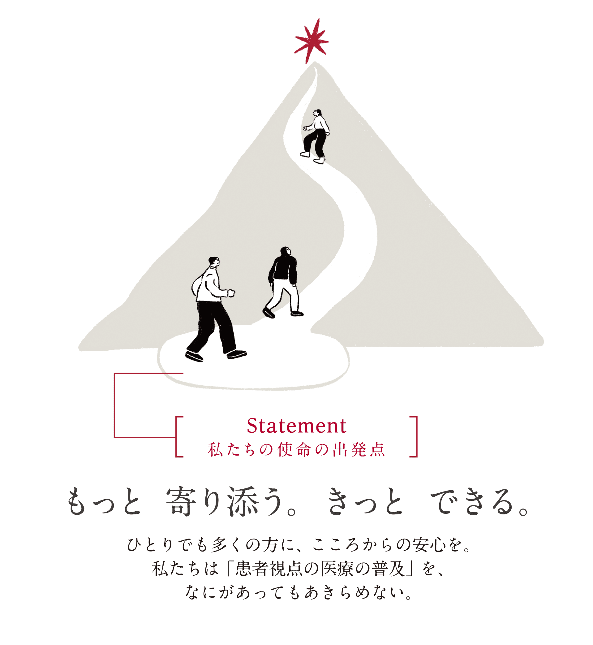 しかし。それでも。だからこそ。私たちは理想をあきらめない人たちと手を結び「患者様にとっての希望とは何か」「私たちに、もっとできることはないか」と問い続けます。その想いを叶えるための行動を、どんなにちいさくとも起こし続けます。今日よりも希望ある明日を創り続ける、変革のチームでありたいと思います。とても難しいことに挑戦していることは承知の上で、あきらめない道をゆく。それが私たちの志のスタート地点です。