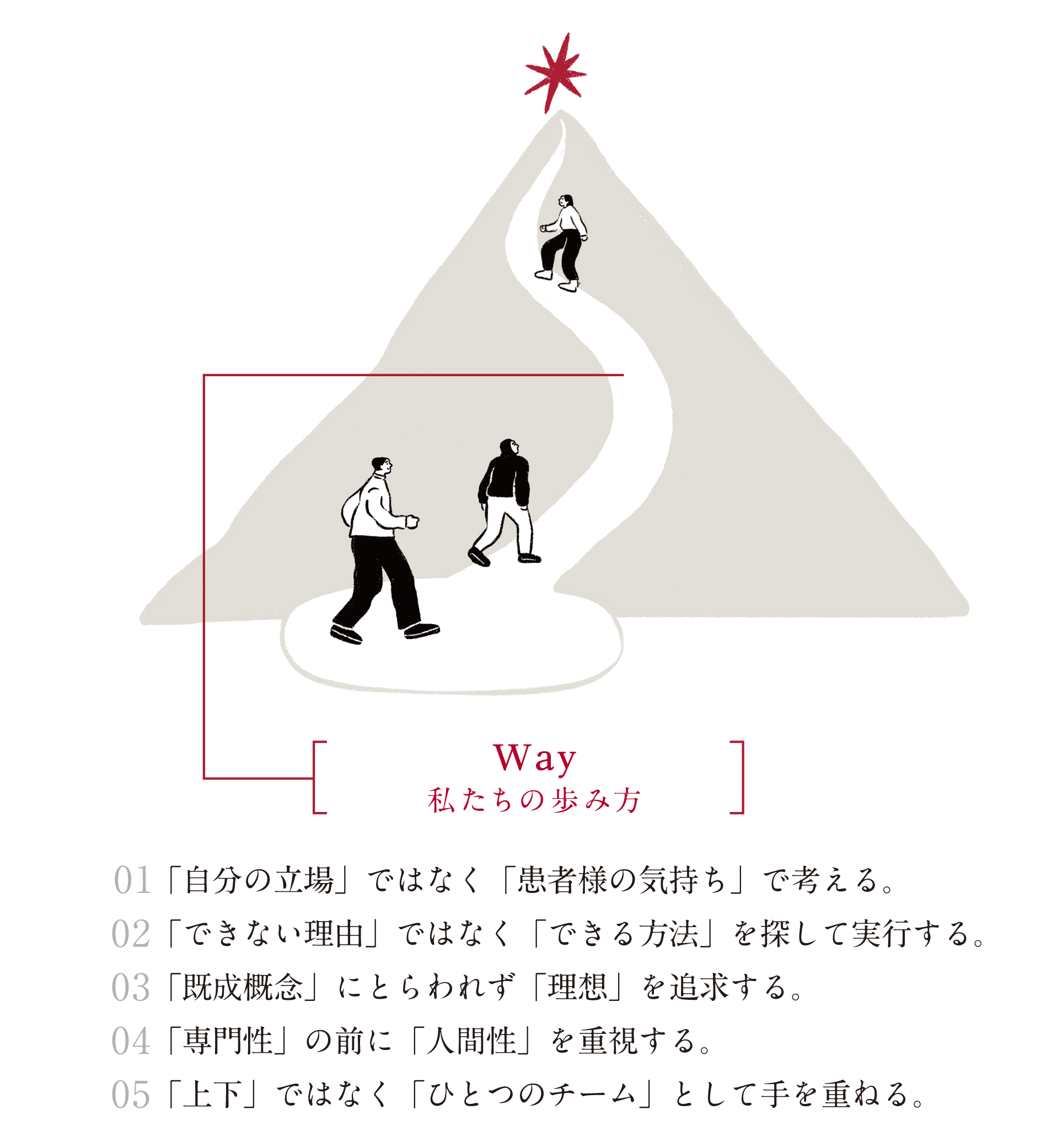 ひとりでも多くの方の生活のそばに、患者視点の医療がゆき渡った社会。それは、一人の人間の力でできることではありません。理想と価値観を同じくした同志とチーム<パートナーズ>が必要なのです。そのために、日々の判断軸やありようをWayとして策定しています。